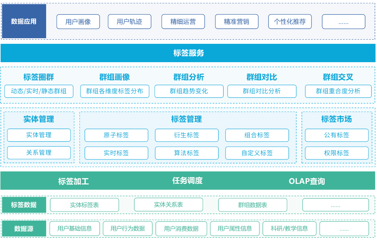 通過標簽萃取、標簽管理、標簽圈群、群組分析、全面畫像,構建以業(yè)務價值為導向的標簽體系和多樣化群組,將數(shù)據(jù)資產(chǎn)標簽化,數(shù)據(jù)標簽價值化,降低運營人員數(shù)據(jù)使用的門檻,減少業(yè)務需求的溝通和開發(fā)成本,應用于企業(yè)智能化運營與營銷,落地數(shù)據(jù)價值。通過對標簽數(shù)據(jù)的用戶的分析,可以進行精準營銷,和智能推薦等相關操作,不斷提升應用服務的質量,不斷的吸引用戶,提供服務。同時,幫助用戶實現(xiàn)深入需求洞察、精準識別和個性推薦等差異化的服務。